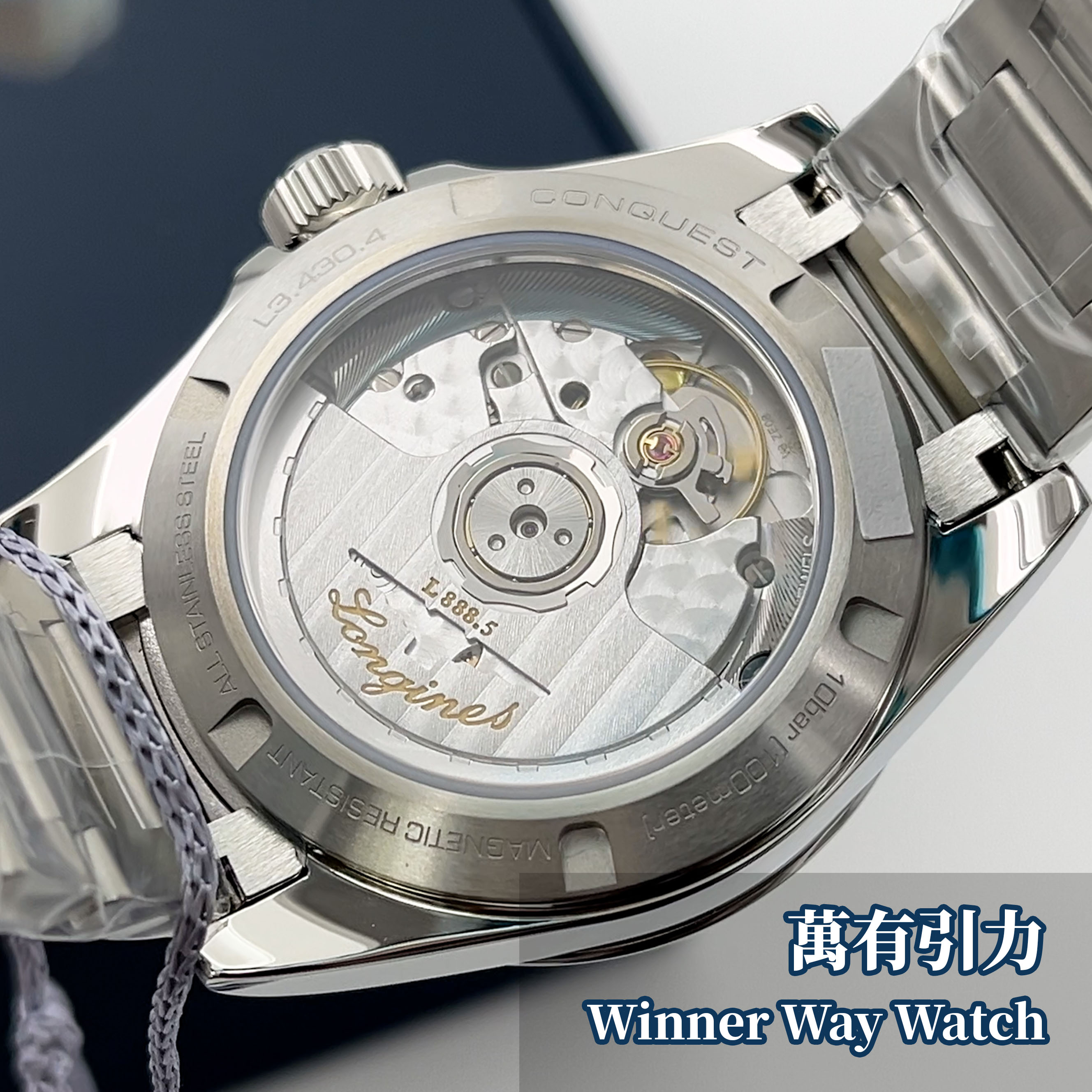 手錶資料:錶殼尺寸:34mm錶殼厚度:10.9mm錶耳距離:41.1mm錶帶寬度:17mm重量:95.3g精鋼錶殼精鋼錶帶藍寶石水晶玻璃旋入式錶背透明底蓋三重折疊錶扣夜光針100米防水L888自動上鍊機芯日期顯示